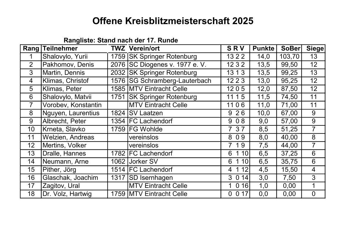 Nach 17 Runden Blitzschach standen die Ergebnisse fest: Yurii Shalovylo vom SK Springer Rotenburg sicherte sich mit 14 Punkten den ersten Platz. Denis Pakhomov vom SC Diogenes erreichte mit 13,5 Punkten den zweiten Platz. Dritter wurde Dennis Martin vom SK Springer Rotenburg mit ebenfalls 13,5 Punkten und schlechterer Zweitwertung als Denis Pakhomov. Beste Jugendliche wurden Matvii Shalovylo vom SK Springer Rotenburg mit 11,5 Punkten und Laurentius Nguyen vom SV Laatzen mit 10 Punkten.