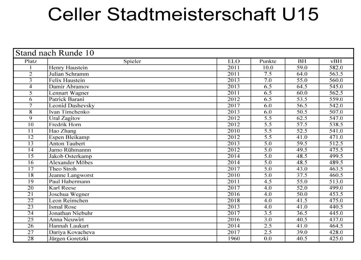 Zu Ferienbeginn hat die Schachsportabteilung des MTV Eintracht Celle eine Stadtmeisterschaft der Altersklassen U8 bis U18 ausgerichtet. Leider war die Beteiligung im Vergleich zum letzten Jahr, wo das Turnier am 2. Ferientag stattfand, dieses Mal nicht so gut. Aber auch mit 11 Kindern und Jugendlichen von 6 bis 16 Jahren war es ein spannendes Turnier. Im Schweizer System mit 20 Minuten Bedenkzeit pro Partie setzten sich die älteren Teilnehmer und die Vereinsspieler nach sieben Runden erwartungsgemäß an die Spitze der Rangliste.