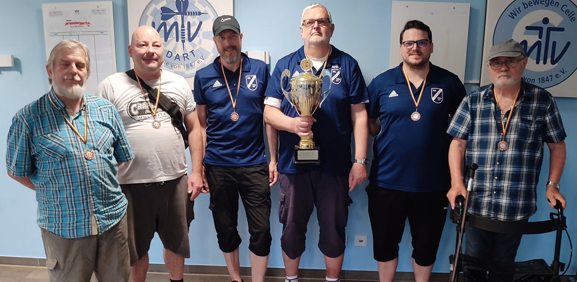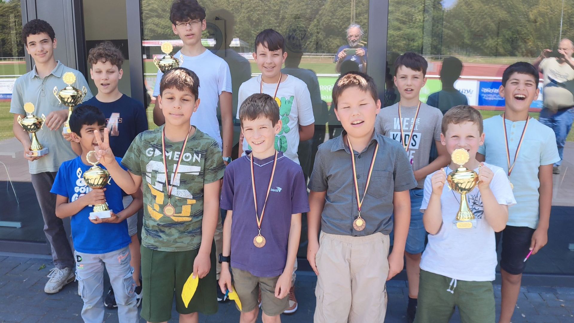 Foto: Siegerehrung mit Urkunden, Pokalen und Medaillen. Teamer hintere Reihe v.r.n.l. Noah, Kutzner, Jan Wedau, Harald Lambrecht, Jürgen Goretzki und Hannes Grunwald.