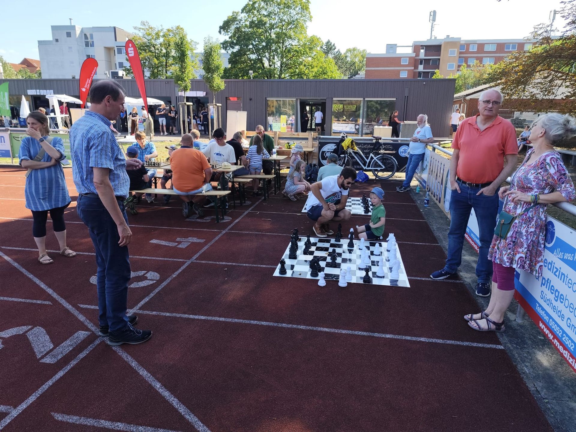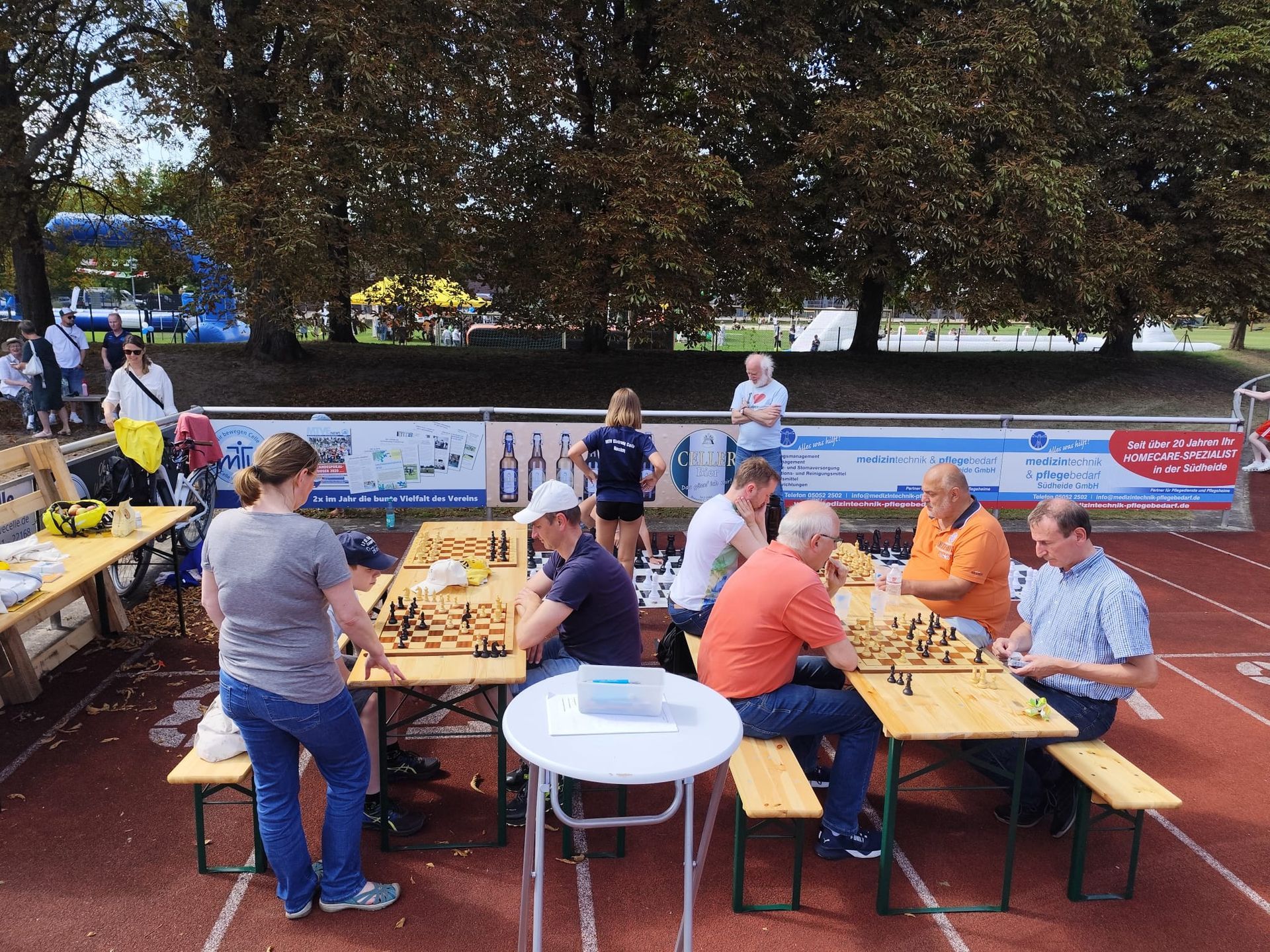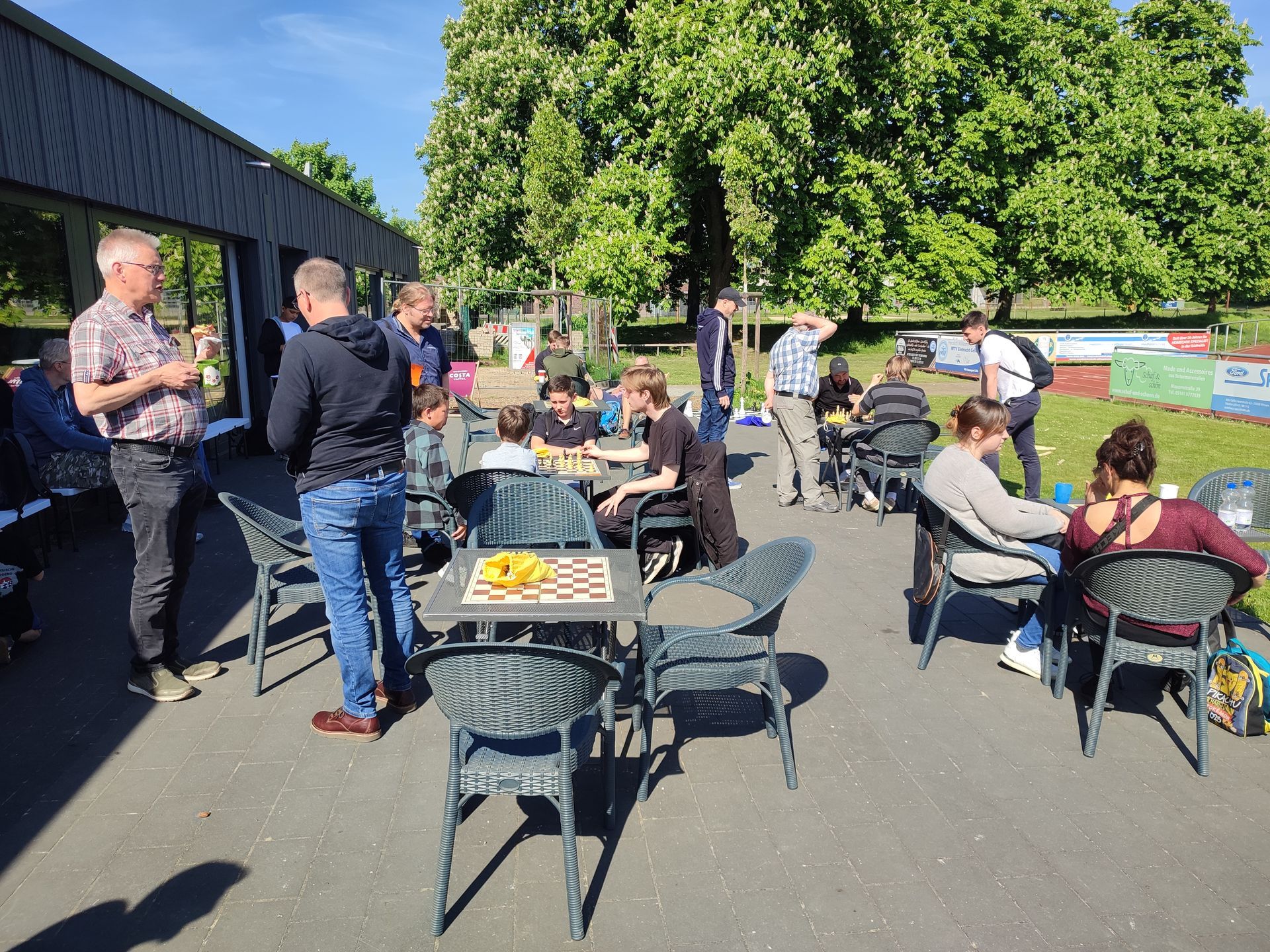 Das sonnige Wetter lud dazu ein, in den Spielpausen auf der Terrasse der Sportanlage des MTVE am Saarfeld Kontakte zu pflegen, Spiele zu analysieren oder sich mithilfe des durch Sven und Sandy Wedau und Harald Lambrecht organisierten Catering zu regenerieren.