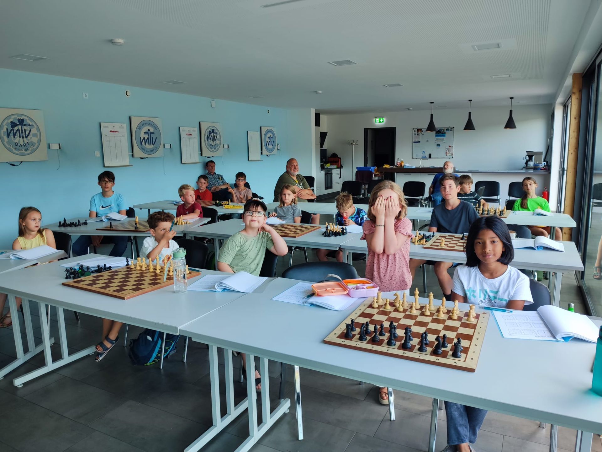 In der letzten Ferienwoche organisierte die Schachabteilung des MTVE wieder eine Schachwoche für Kinder. Mit seinem Seniorteam Harald Lambrecht,Jürgen Goretzki und Manfred Stammschroer und den Sportassistenten Jan Wedau, Noah Kutzner (beide 15) und Hannes Grundwald bereitete Übungsleiter Knut Weinreich neunzehn Schachschüler_innen im Alter von 8 bis 12 Jahren auf die Diplomprüfungen des Deutschen Schachbundes vor.