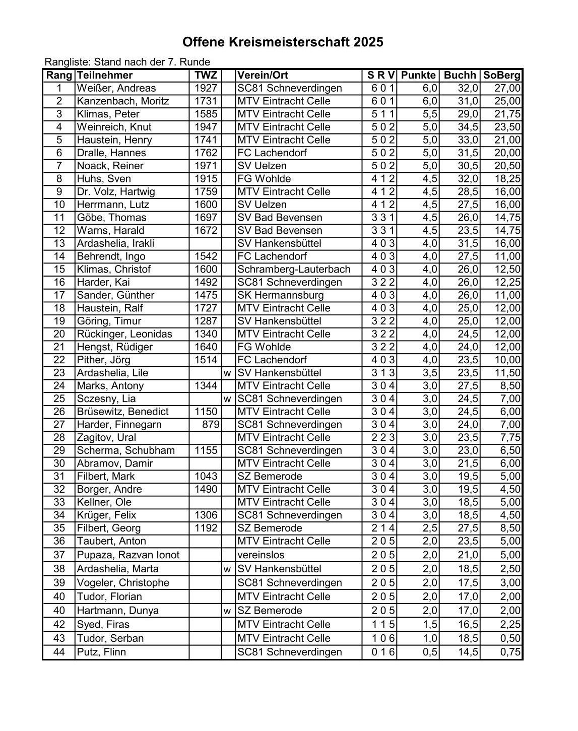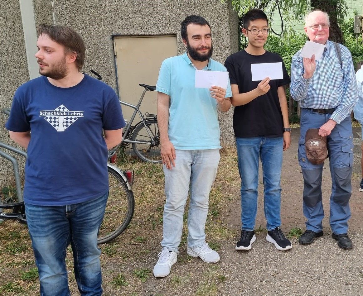 Die weiteren Ergebnisse der Celler Spieler, Hannes Leon Grunwald, Platz 11 mit 11,5 Punkten, Manfred Stammschroer, Platz 13 mit 11 Punkten, Dr. Hartwig Volz, Platz 16 mit 10,5 Punkten und Leonidas Rückinger, Platz 24 mit 3 Punkten.