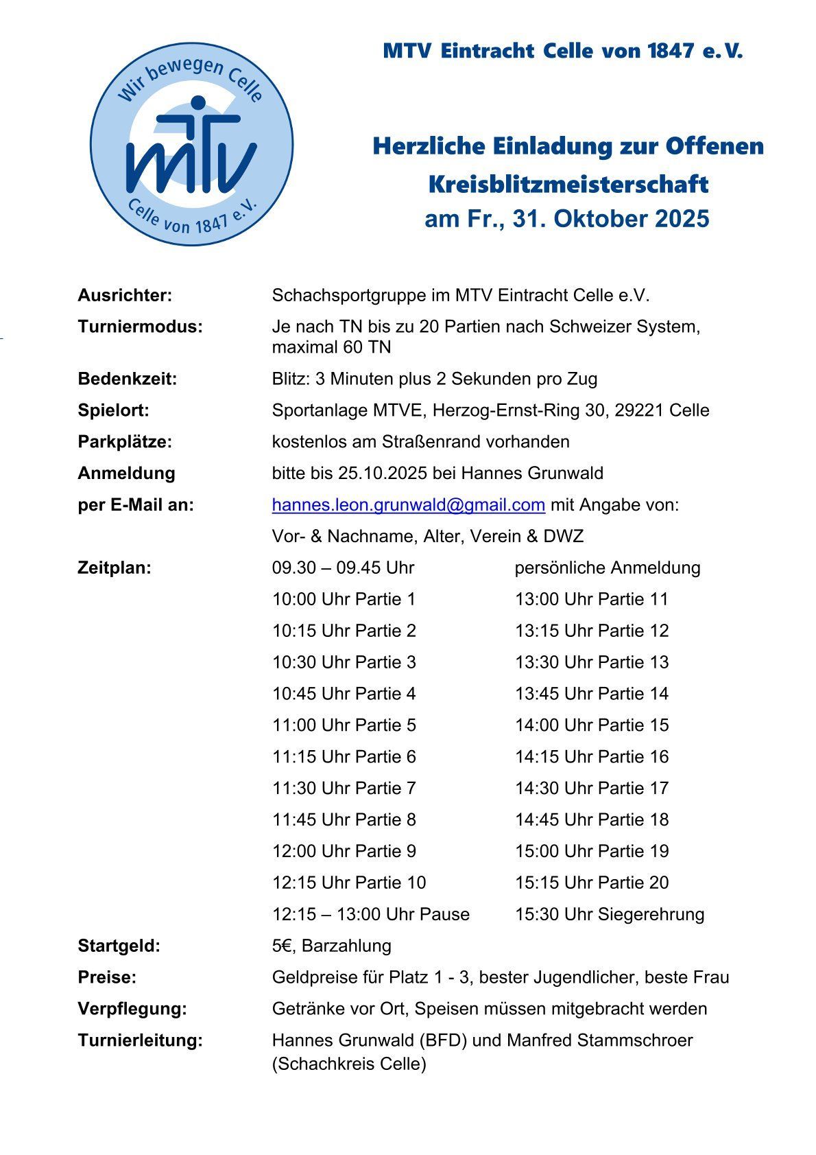 Aufgrund des großen Erfolgs der in den vergangenen Jahren vom MTVE ausgerichteten Schnellschach-, Mannschafts- und Schulschachturniere plant die Schachabteilung im spielfreien Oktober unter der Federführung von Hannes Grunwald, der als FSJ-ler gerade die Übungsleiterlizenz Schach als Breitensport erwirbt, die erstmalige Ausschreibung eines Kreisblitzturniers.